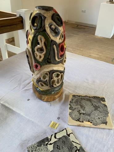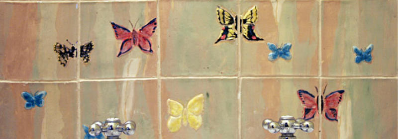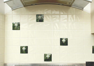 The tiles seen here are all hand-made, in Fiona Sandover’s studio, Chreode Pottery. They are coloured and fired using top quality ceramic materials and are totally original in design.The current range is based on exquisite old lace samples, which have been used to create a thoroughly modern look. The tiles are coloured with a wide range of ceramic stains to suit any decor.